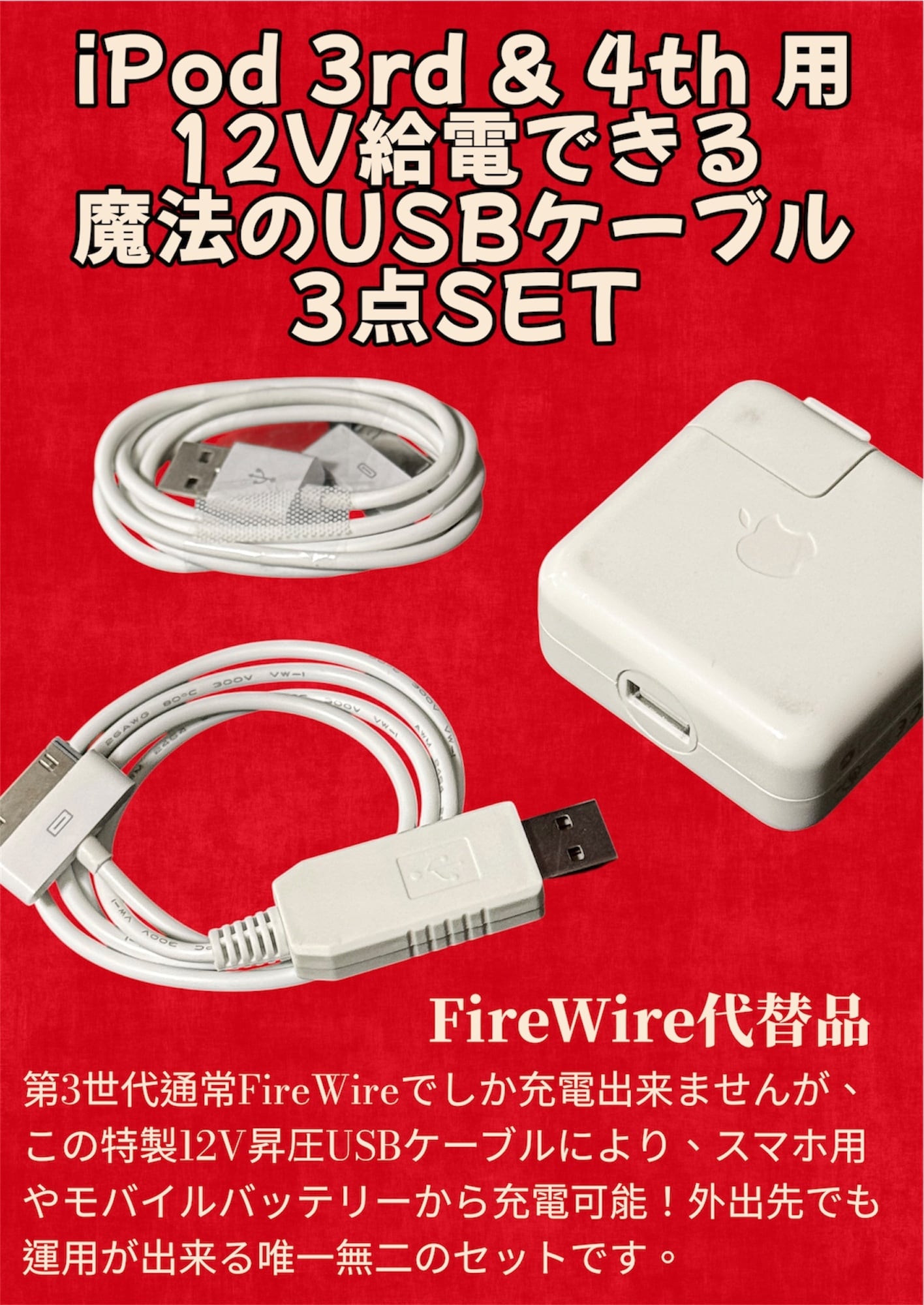 【完全復活キット】iPod 3rd&4th専用 12V昇圧USBケーブル 3点セット(純正ACアダプタ付)【FW-12V3S-01】